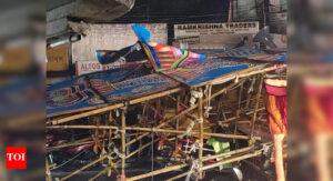 A stall at a Puja pandal being devastated during a squall in Cachar on Maha Ashtami evening Silchar: Torrential rain...
