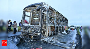 Charred remains of a Hyderabad-bound private bus that caught fire after a collision with a two-wheeler, near Chinnatekur in Kurnool...