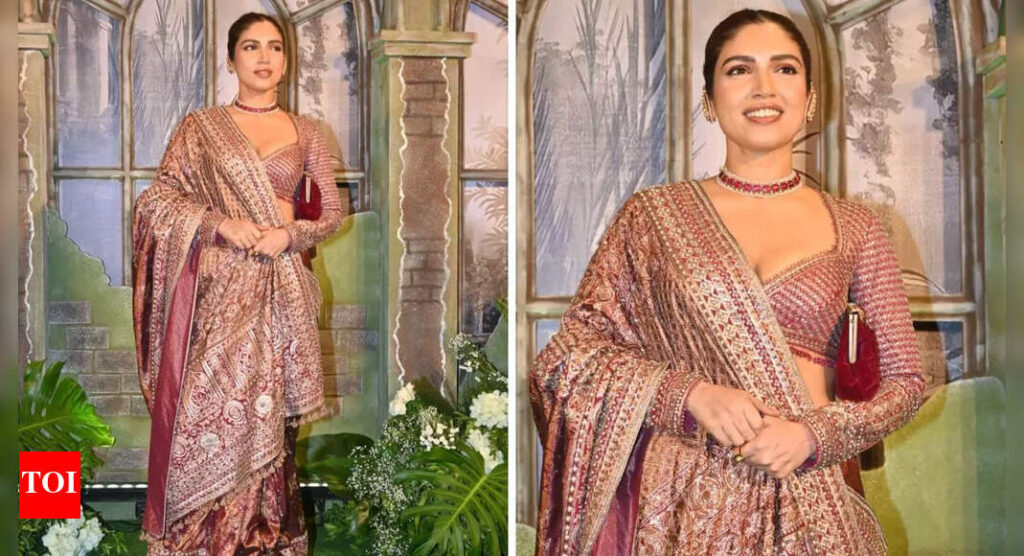 Bhumi Pednekar channels royalty in wine Kanjeevaram embellished saree worth Rs 6.87 lacs for Vedant Birla and Tejal Kulkarni’s wedding reception – PICS | Hindi Movie News