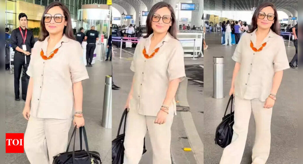 The ‘Hichki’ actress made sure her airport look is stunning as well as comfy. She wore a beige co-ord set, which she paired with a striking red necklace. Completing the look were brown shades and a smart black bag.