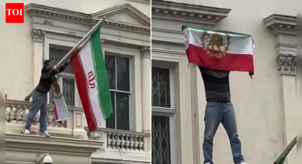 Iran pre-Islamic revolution flag was briefly hoisted on the Iranian embassy in London. A video going viral on social media shows a man climbing up the building as he tears down the Iranian regime flag and replaces it with the pre-1979 flag with a lion and sun during a demonstration on Saturday.Hundreds of other protestors gathered outside the building were also seen waving the pre-Islamic revolution flag, chanting anti-government slogans.The flag stayed in place for several minutes before being removed, news agency AFP reported.Fresh protests also flared across Iran on Friday, in Tehran, Mashhad, Tabriz and the holy city of Qom, chanting slogans against Supreme Leader Ayatollah Ali Khamenei. In Tehran’s Sa’adat Abad district, residents banged pots and pans and blared car horns in a show of defiance, undercutting state media assertions that calm had returned.The demonstrations, described as the biggest since the 2022–23 unrest triggered by Mahsa Amini’s death in custody, began on December 28 amid soaring living costs and the rial’s plunge, and have since shifted into open challenges to Iran’s clerical system.