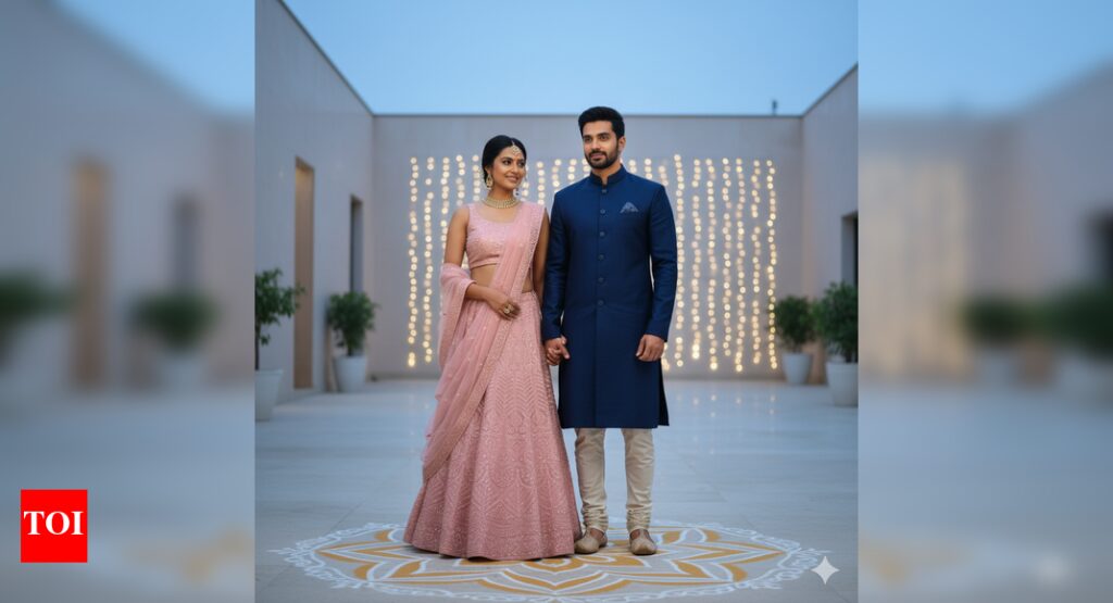 - Modern Minimalist: Convert the couple’s image into a stylish, photo-realistic portrait. They are wearing contemporary Indo-Western festive outfits—the woman in a chic, embroidered blush pink lehenga skirt, the man in a sleek navy blue kurta. They are posing in a modern, open courtyard featuring a clean, geometric white and gold rangoli. Soft, cool evening light with subtle fairy lights in the background.