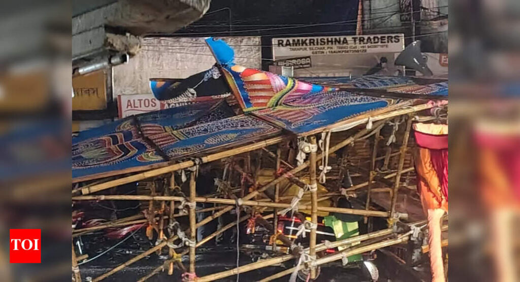 Silchar: Torrential rain and thunderstorms over the past three days have cast a shadow on Durga Puja festivities across the Barak Valley, disrupting pandal-hopping, damaging decorative structures and affecting idol immersion on Vijaya Dashami.An abrupt squall on Maha Ashtami evening tore through Cachar district, flattening welcome arches and snapping light frames across several Puja venues. What witnesses likened to a ‘sandstorm’ saw trusses sway and gates collapse within minutes.Traffic near Birbal Bazar in Meherpur was disrupted after a decorative gate fell onto an auto-rickshaw, leaving the vehicle damaged though no serious injuries were reported. In Udharbond, the gateway to the popular Hospital Road Puja was blown down, while festoon lighting and pandal facades at Kalibari Road & other stretches in Cachar also suffered damage.Power supply across parts of Silchar snapped soon after the storm. Many pandals relied on generators as volunteers disconnected live wires to prevent mishaps in waterlogged lanes.The Regional Meteorological Centre (RMC) in Guwahati warned of ‘thunderstorms with lightning and heavy rain at isolated places’ in Cachar and surrounding districts.Despite the weather setback, immersion of idols on Dashami evening lent an international flavour at Kalibari Ghat on the Kushiyara river in Sribhumi town. More than a hundred idols from both India and Bangladesh were immersed in the transboundary river that divides the two countries in South Assam.