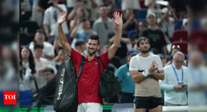 Novak Djokovic of Serbia waves to spectators as he leaves the court after losing his men's singles semifinal match to...