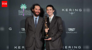 Josh Safdie, left, and Timothee Chalamet, with the spotlight actor of the year award for "Marty Supreme," pose in the...